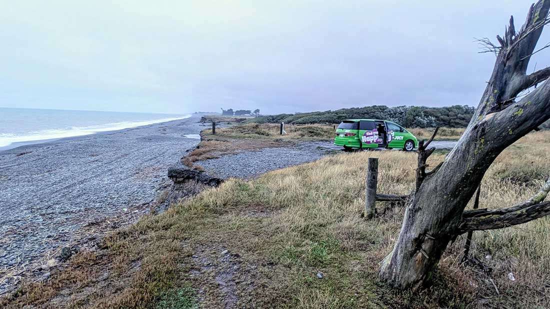 Ein Cache am Ende eines Weges direkt am Meer führt uns zur ersten genialen Übernachtung (GC3QXZ0). Da stört auch nicht, dass es recht kühl ist.